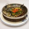 Ingrediente: biban intreg 350g, ceapa verde 20g, ghimbir 20g, ardei gras 20g, piper 5g, sos de soia 40g